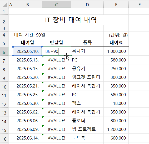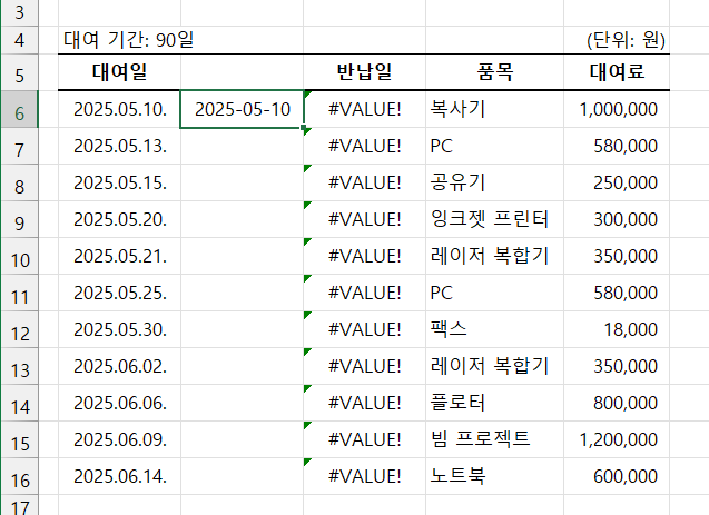 하지만 현재 대여일은 연월일 사이가 점으로 구분되어 있어 날짜가 아닌 텍스트로 인식해 계산 결과에 문제가 생기는 겁니다.
