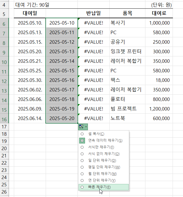 그리고 [채우기 옵션]을 눌러 [빠른 채우기]를 선택하면 위와 같은 문제는 해결할 수 있습니다.