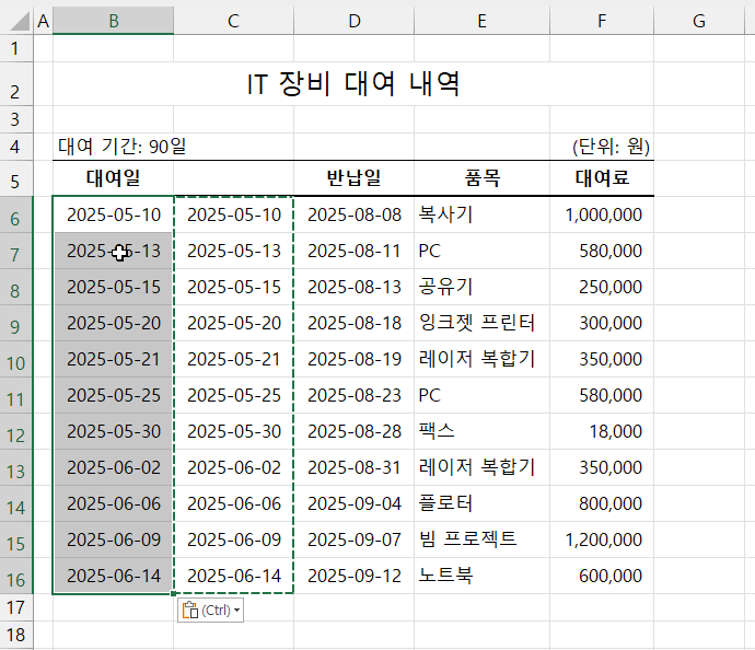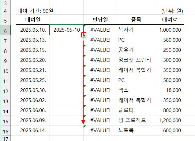 형식을 변경한 대여일을 복사해 붙여넣고 열은 삭제합니다.