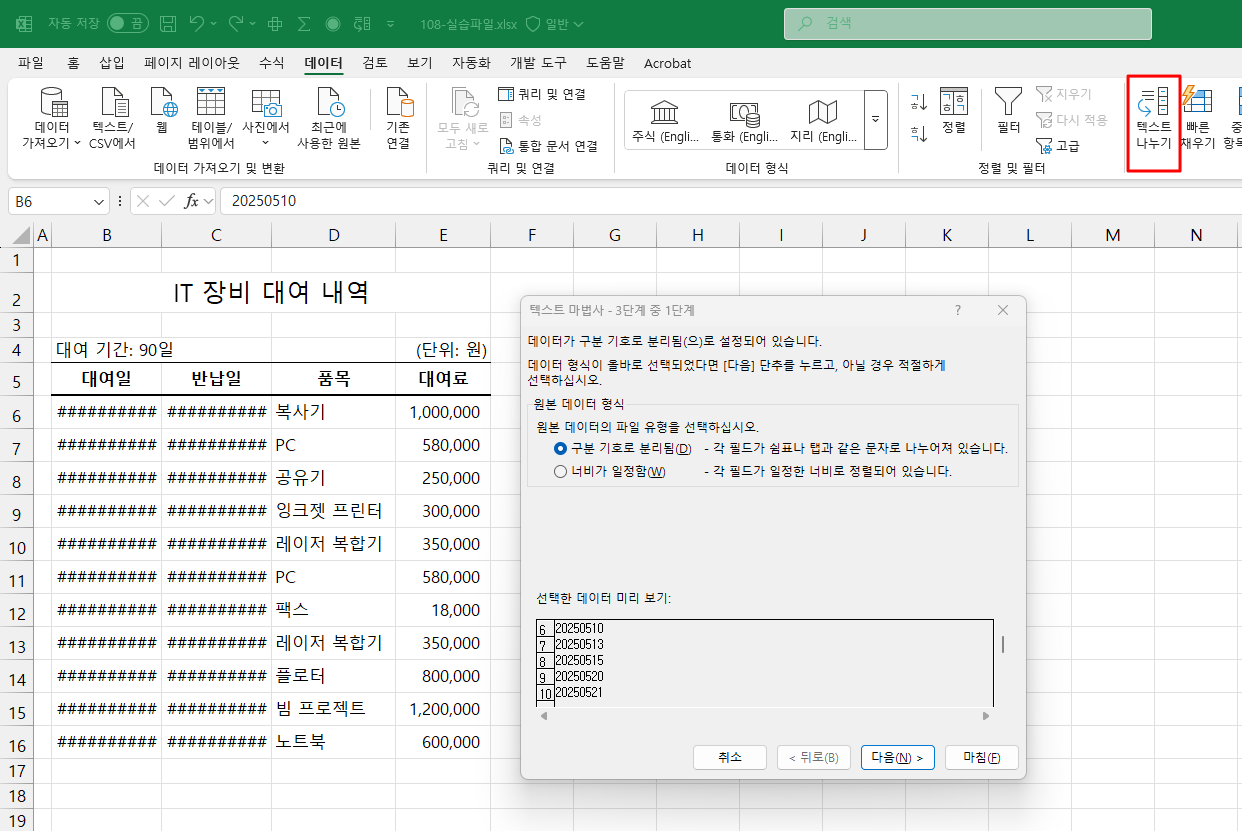 대여일 범위가 선택되어 있는 상태에서 [데이터] 탭 - [텍스트 나누기]를 선택합니다.