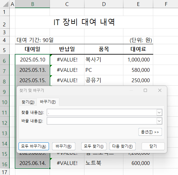 먼저 대여일 범위를 선택하고 단축키 <Ctrl + H>를 눌러 [찾기 및 바꾸기]를 실행합니다.