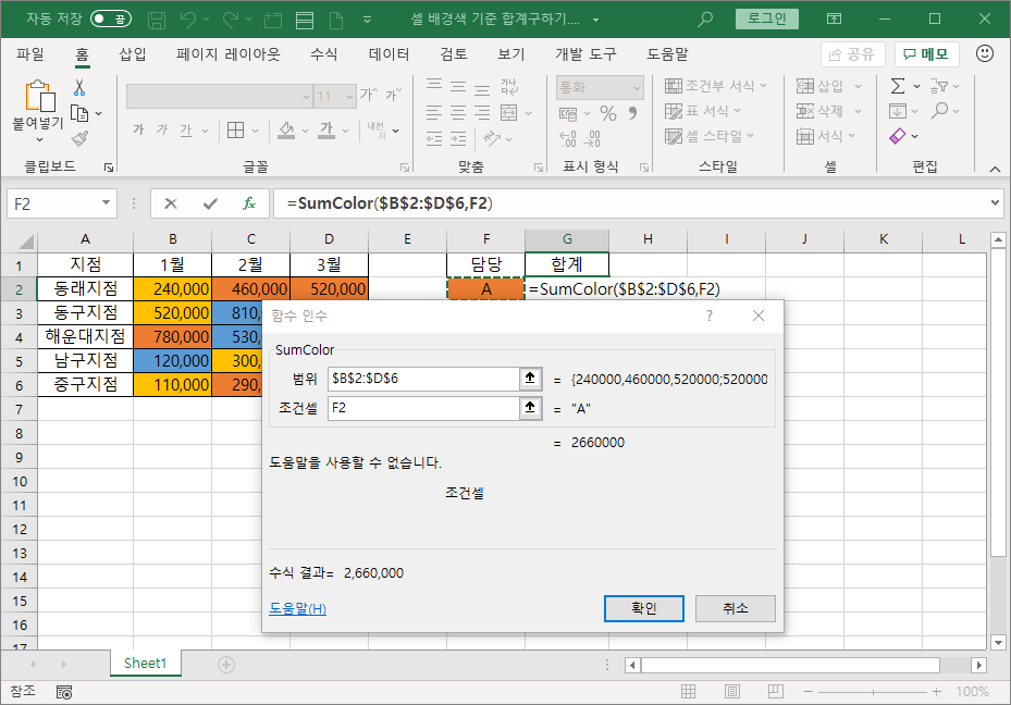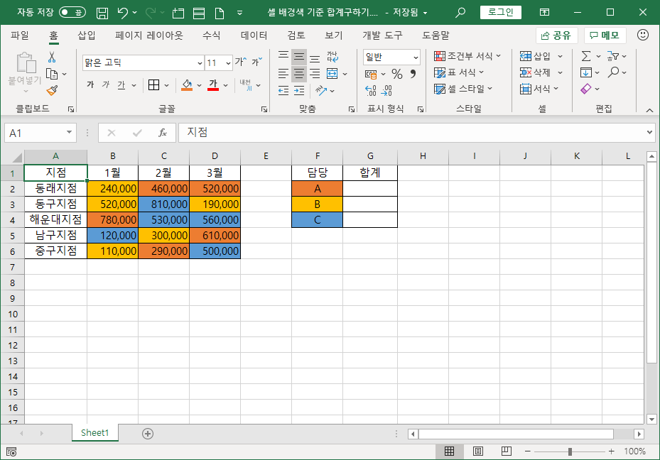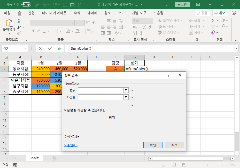 셀 배경색을 기준으로 합계를 구하기 입니다.