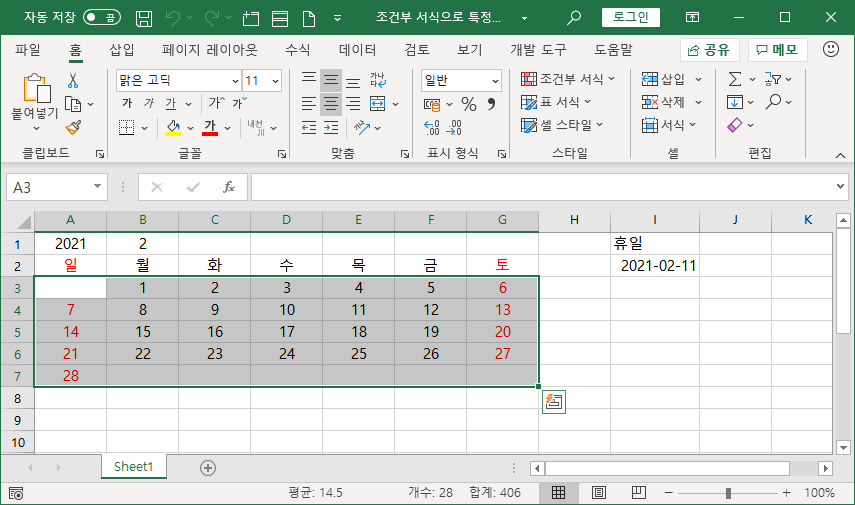 달력으로 나타낸 영역에서 사용자가 입력한 특정 날짜를 휴일에 해당하는 글꼴 색으로 조건부 서식을 이용해 나타내는 방법을 소개하겠습니다.