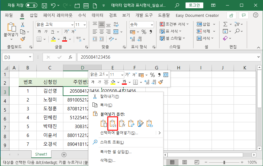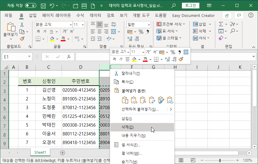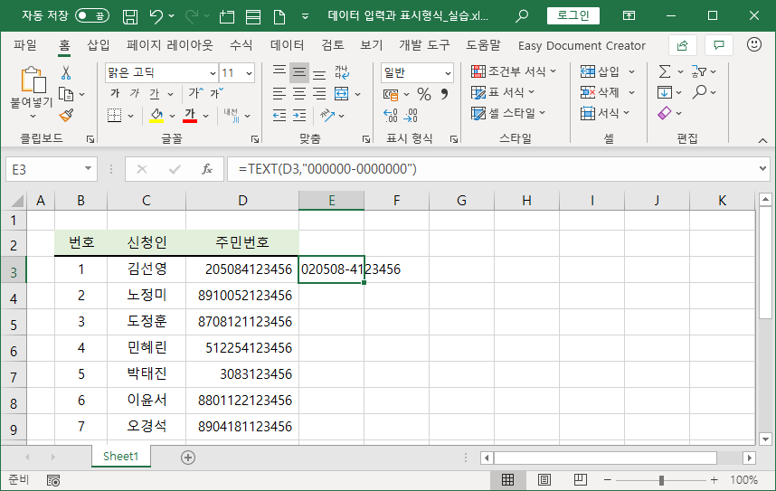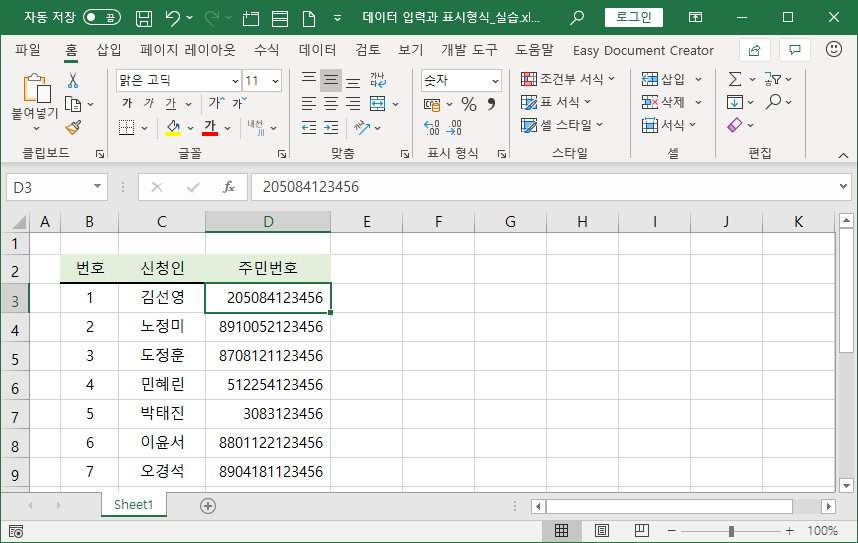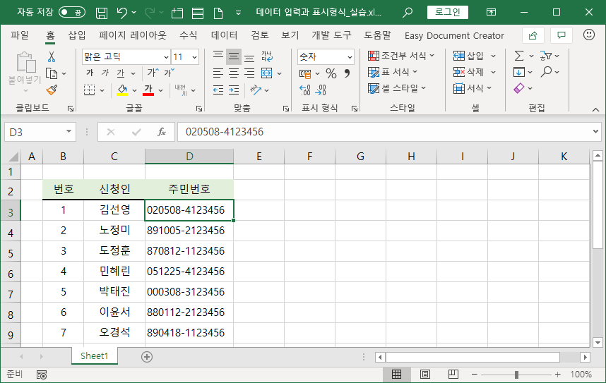 실습 파일은 이미 주민번호가 입력되어 있습니다.