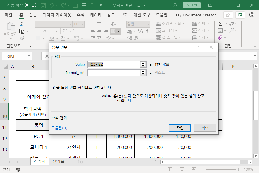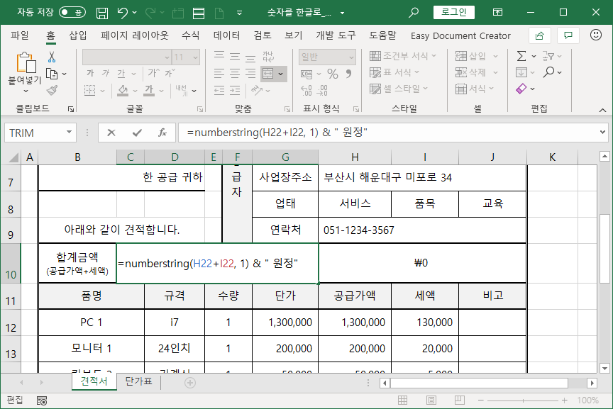 [C10] 셀과 [H10] 셀 두군데 합계금액을 나타내는데, [C10] 셀엔 한글로 나타내고, [H10] 셀엔 숫자로 나타냅니다.