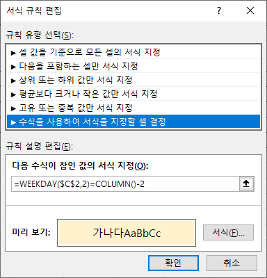 COLUMN 함수 값에 2를 뺀 이유는 C열이 월요일에 해당하기 때문에 COLUMN 함수 결과값으로 3이 나오면 월요일에 해당하는 1로 만들기 위한 것입니다.
