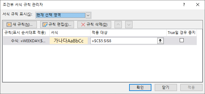 조건부 서식 규칙 관리자 대화상자에 현재 선택된 셀에 등록된 조건부 서식이 보입니다.