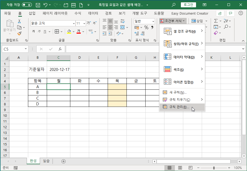 [홈]-[스타일]-[조건부 서식]-[규칙 관리]를 선택합니다.