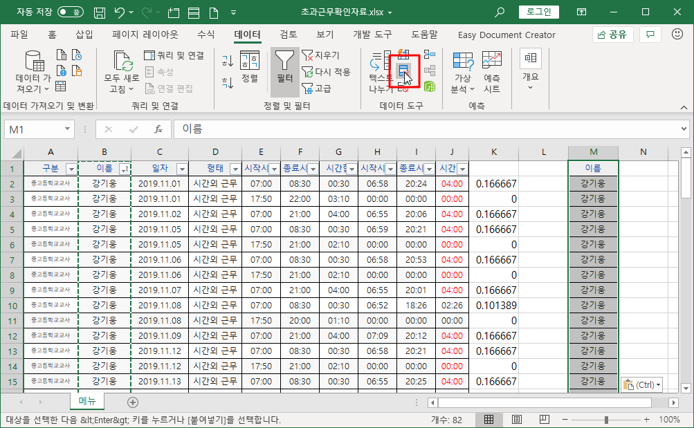 학교 업무 프로그램에서 다운로드한 엑셀 파일 데이터를 이용해서 일자별 초과근무시간으로 개인별 초과근무시간 합계를 구하려고 합니다.