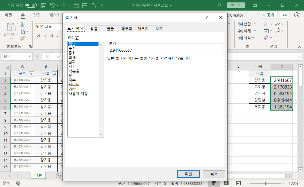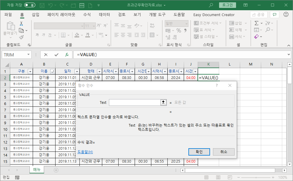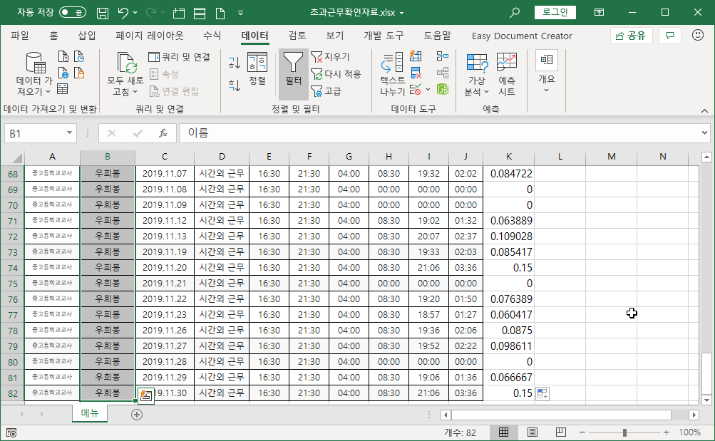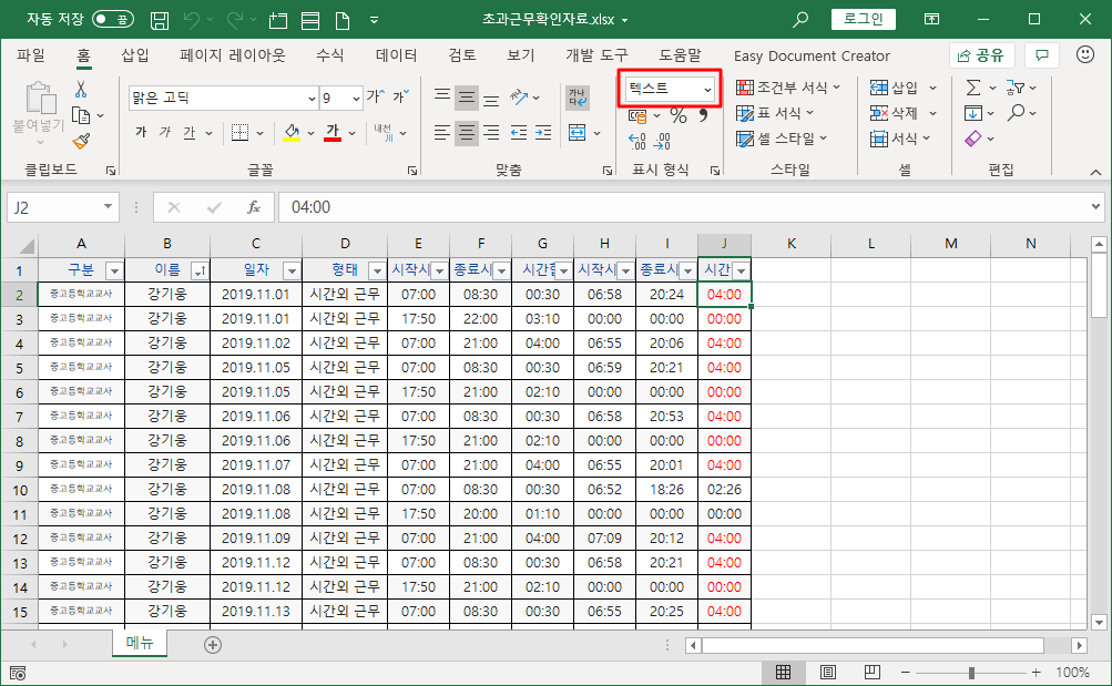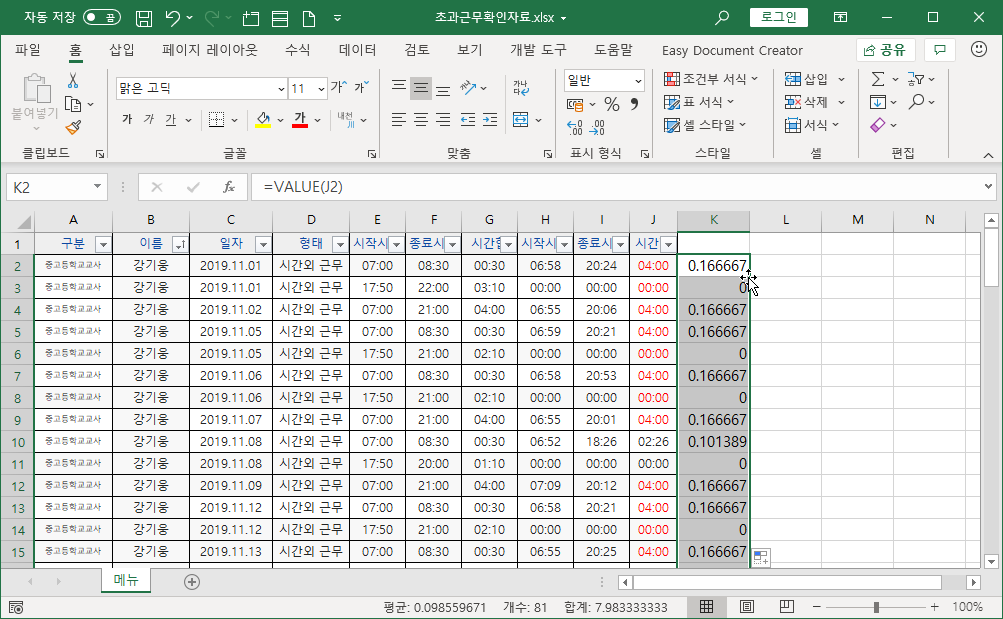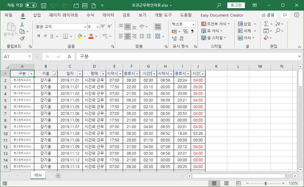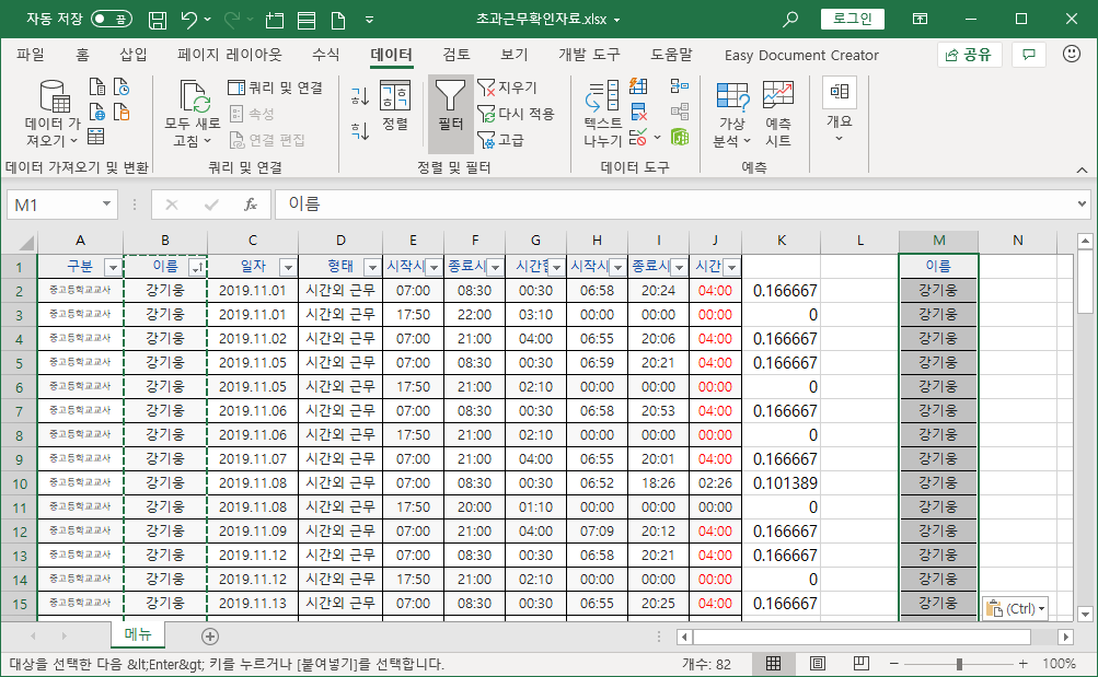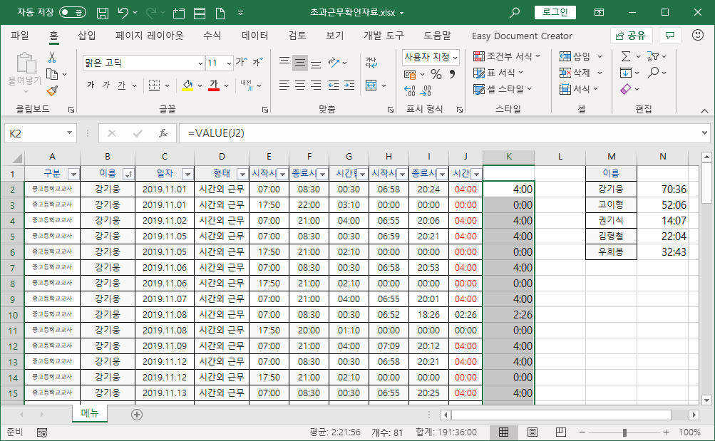 학교 업무 프로그램에서 다운로드한 엑셀 파일 데이터를 이용해서 일자별 초과근무시간으로 개인별 초과근무시간 합계를 구하려고 합니다.