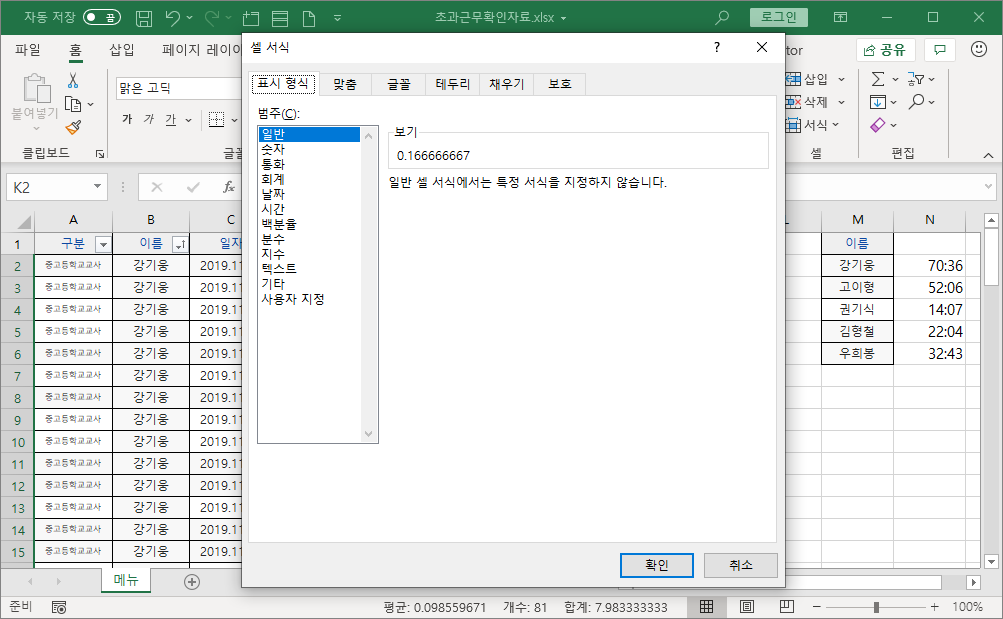 [K2:K82] 셀 범위 시간에 해당하는 숫자로 변환된 값도 시간 형식으로 나타내려면 셀 서식에서 형식을 바꾸면 됩니다.