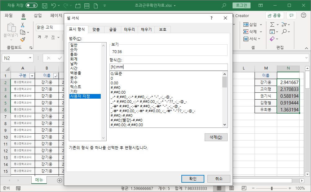 범주에서 [사용자 지정]을 선택하고 [형식]에 h:mm을 입력합니다.