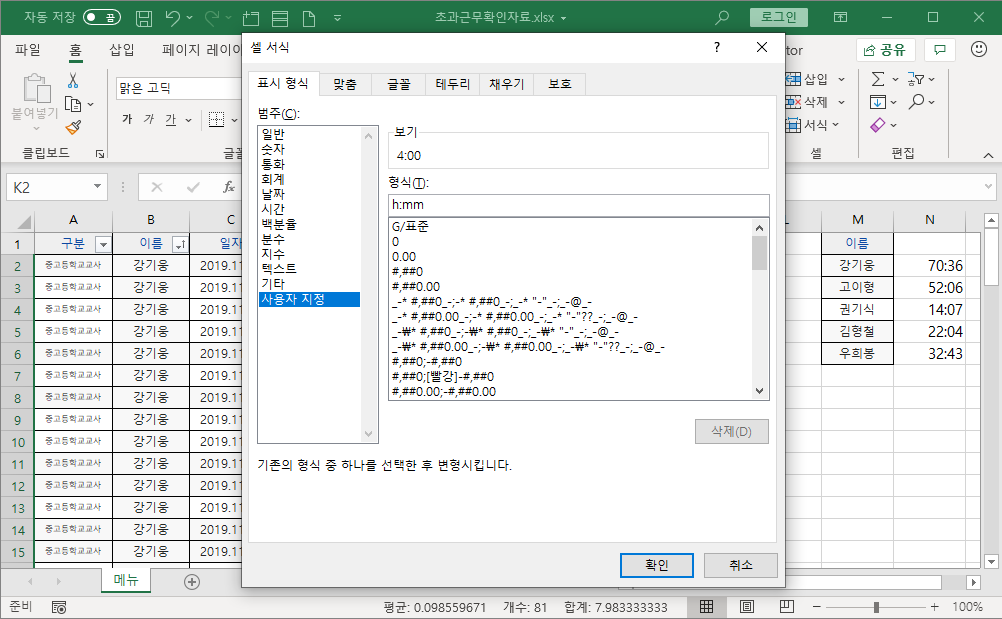 [K2:K82] 셀 범위 값은 24시간을 넘지 않기 때문에 형식으로 h:mm을 입력해도 결과가 바뀌어 나타나지 않습니다.