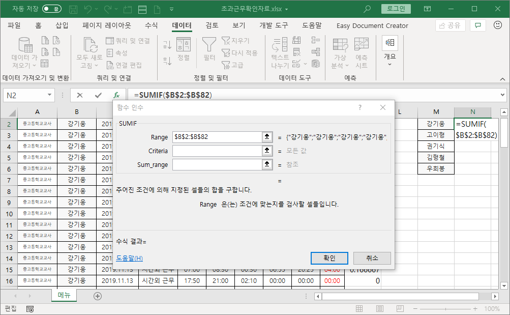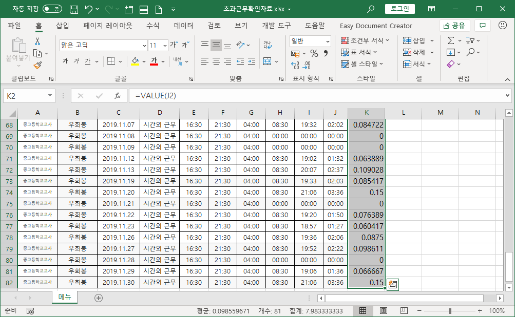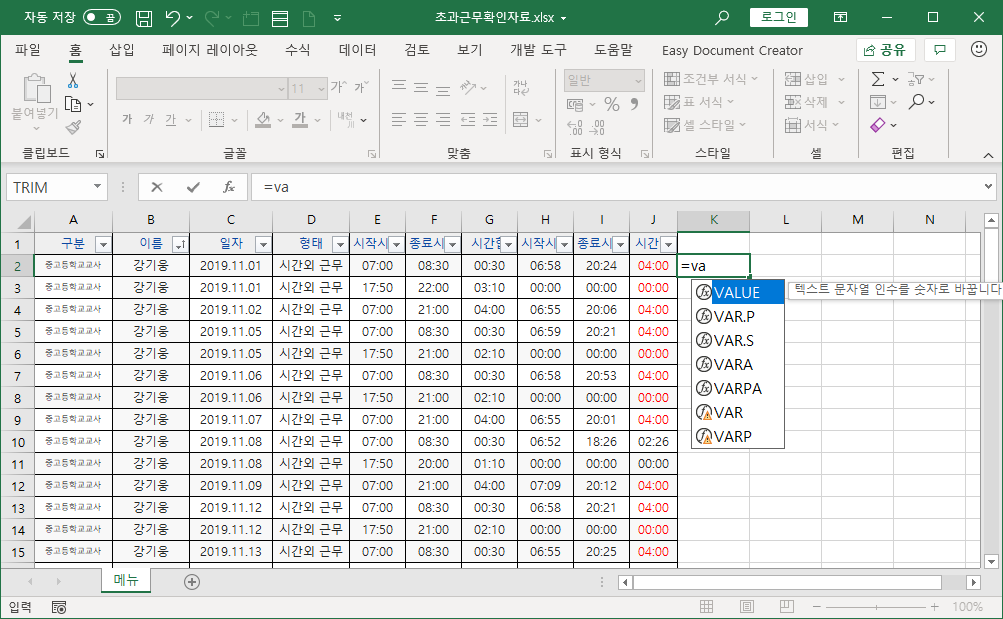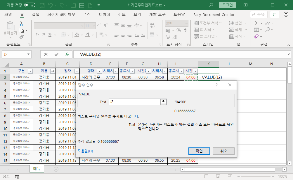 학교 업무 프로그램에서 다운로드한 엑셀 파일 데이터를 이용해서 일자별 초과근무시간으로 개인별 초과근무시간 합계를 구하려고 합니다.
