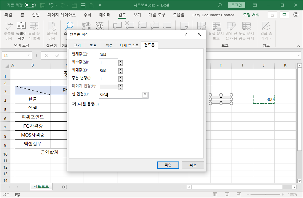 [현재값] 300, [최소값] 1, [최대값] 500, [셀 연결] D4셀 선택 합니다.