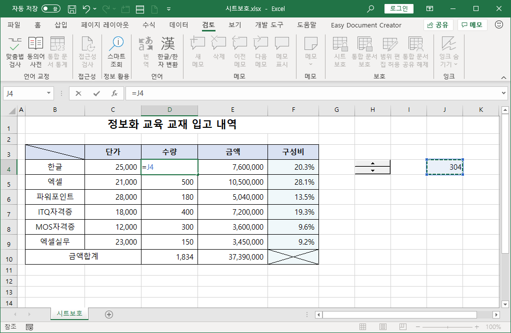 스핀 단추와 연결된 셀은 [J4] 셀이고, [J4] 셀은 [잠금]을 해제했기 때문에 [시트 보호]가 된 상태에서도 값을 바꿀 수 있습니다.