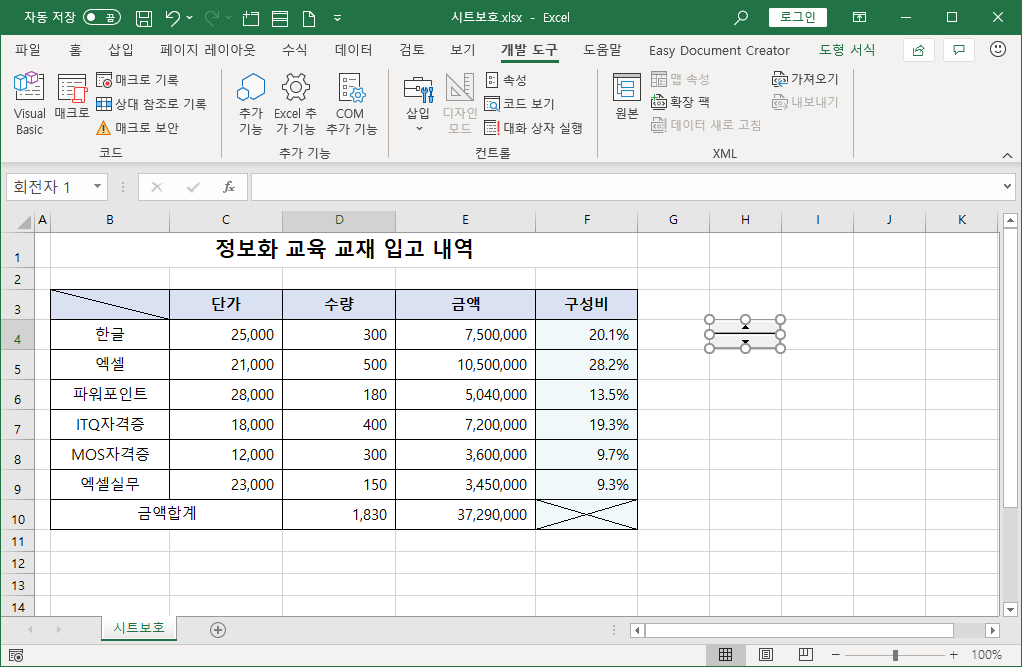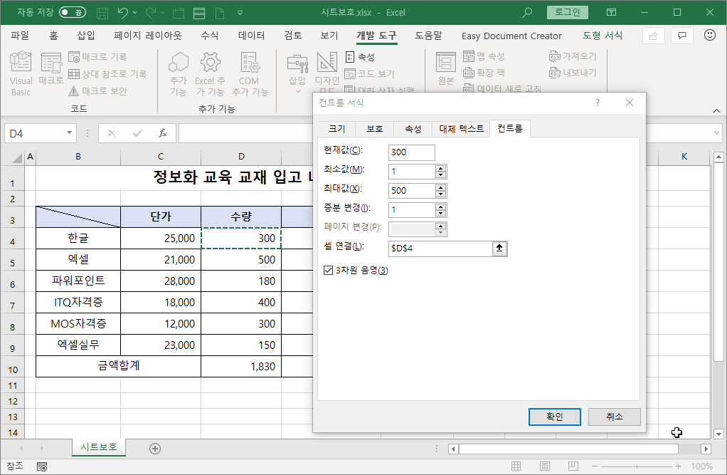 [D4] 셀 값을 사용자가 직접 바꾸지 못하도록 하기 위해 스핀 단추를 연결하겠습니다.