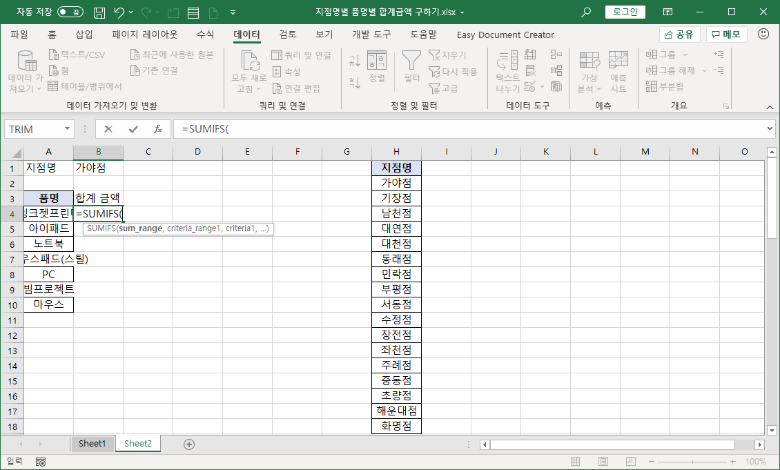 이번 강좌에서는 데이터 유효성 검사 기능으로 지점명 목록을 표시하고, 사용자가 지점명을 선택하면 품명별 판매금액 합계를 SUMIFS 함수로 수식을 작성해 나타내 보겠습니다.