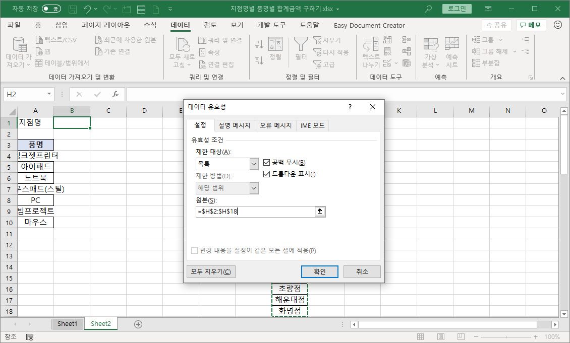 사용자가 지점명을 입력하지 않고 나타난 목록에서 선택하도록 데이터 유효성 검사 기능을 쓰기 위해 Sheet1 시트에서 지점명 [B1:B57] 셀 범위를 복사해 Sheet2 [H1] 셀에 붙여넣습니다.