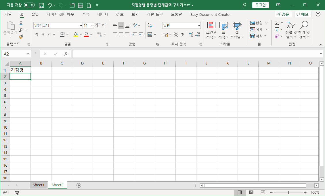 새로 추가된 시트 Sheet2 [A1] 셀에 '지점명'을 입력합니다.