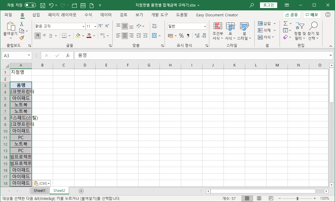 판매내역을 지점명과 품명을 기준으로 집계하여 보기 좋게 나타내는 방법을 소개하겠습니다.