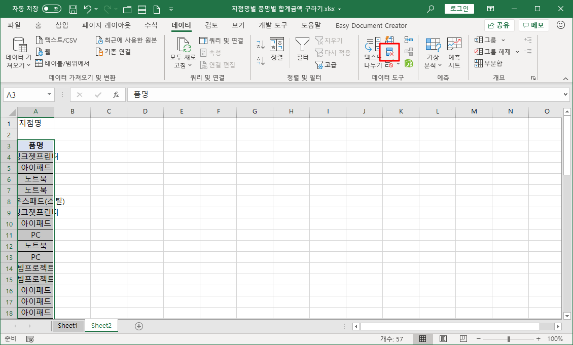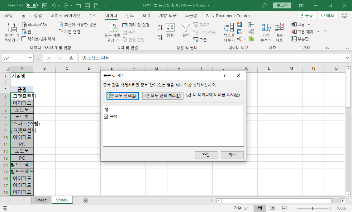 중복된 품명을 제거하기 위해 범위 선택된 상태에서 [데이터]-[데이터 도구]-[중복된 항목 제거]를 선택합니다.