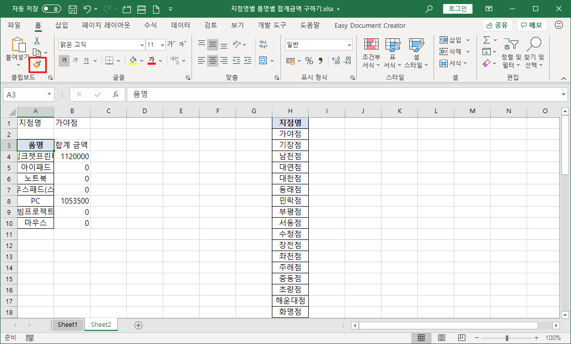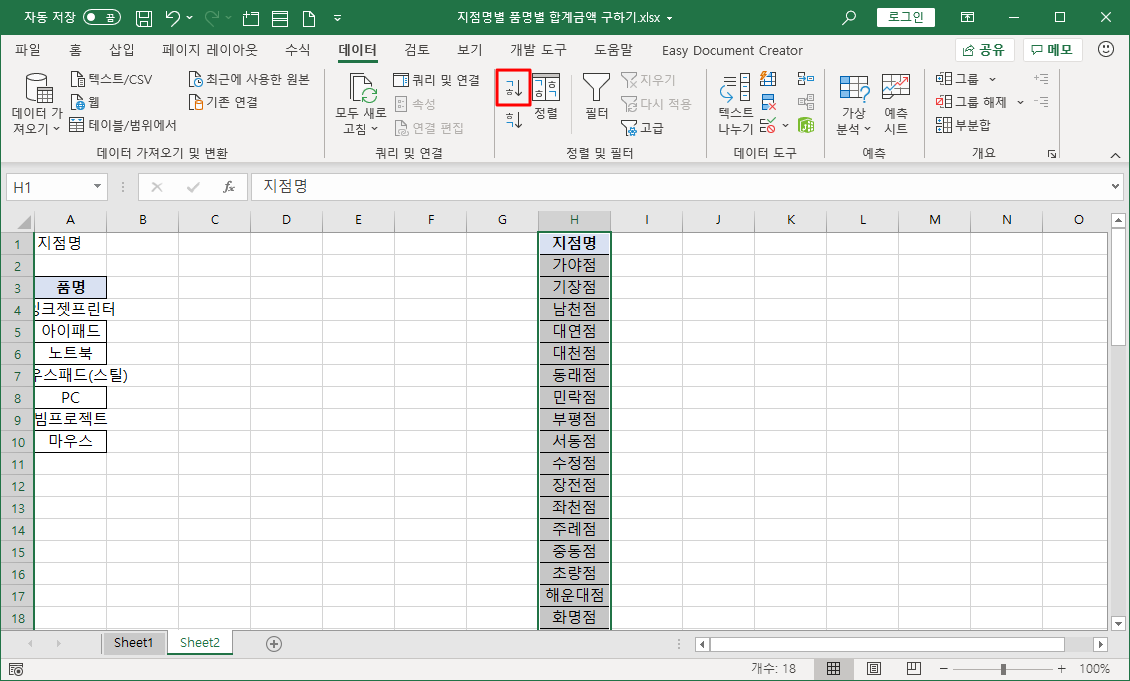 새 시트를 하나 추가해 지점별 품명별 판매금액을 나타냅니다.