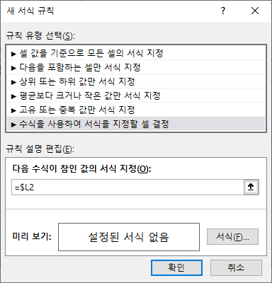결과 값이 나타날 첫번째 셀이 [L2] 셀을 기준으로 수식을 작성했지만 조건부 서식이 적용되면 결과가 나타날 각 행에 조건식이 적용되어 서식이 나타납니다.