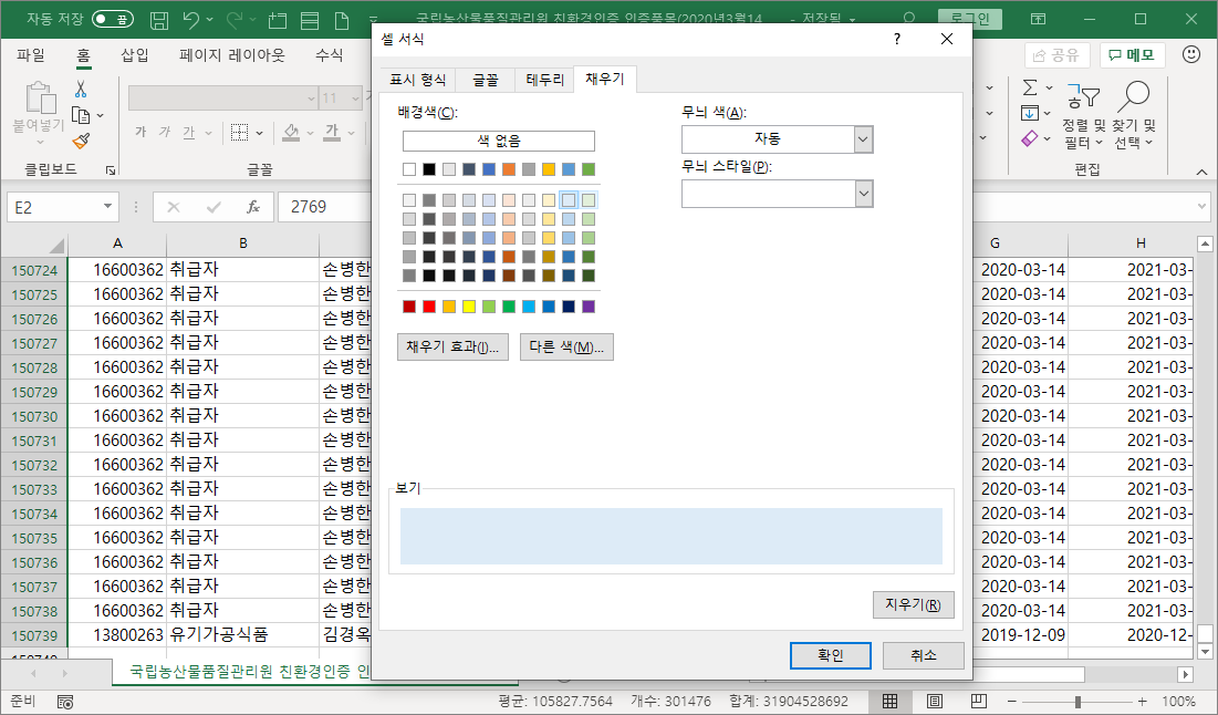 [E2:F150739] 셀 범위를 선택한 상태에서 [표시 형식]-[일반]을 선택합니다.