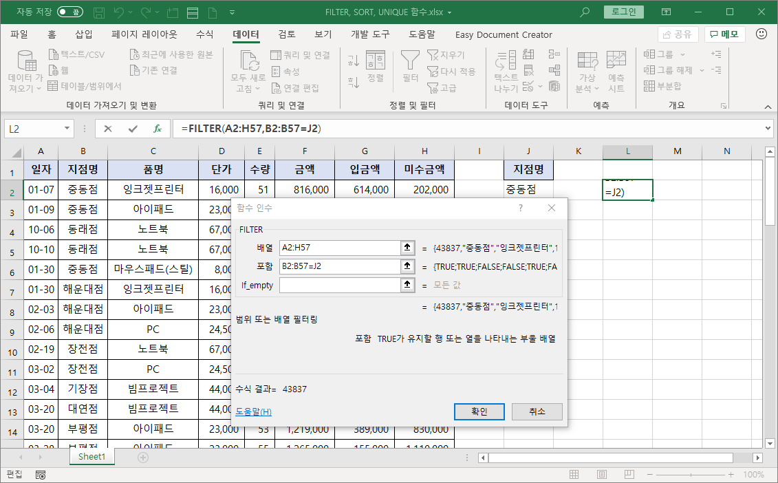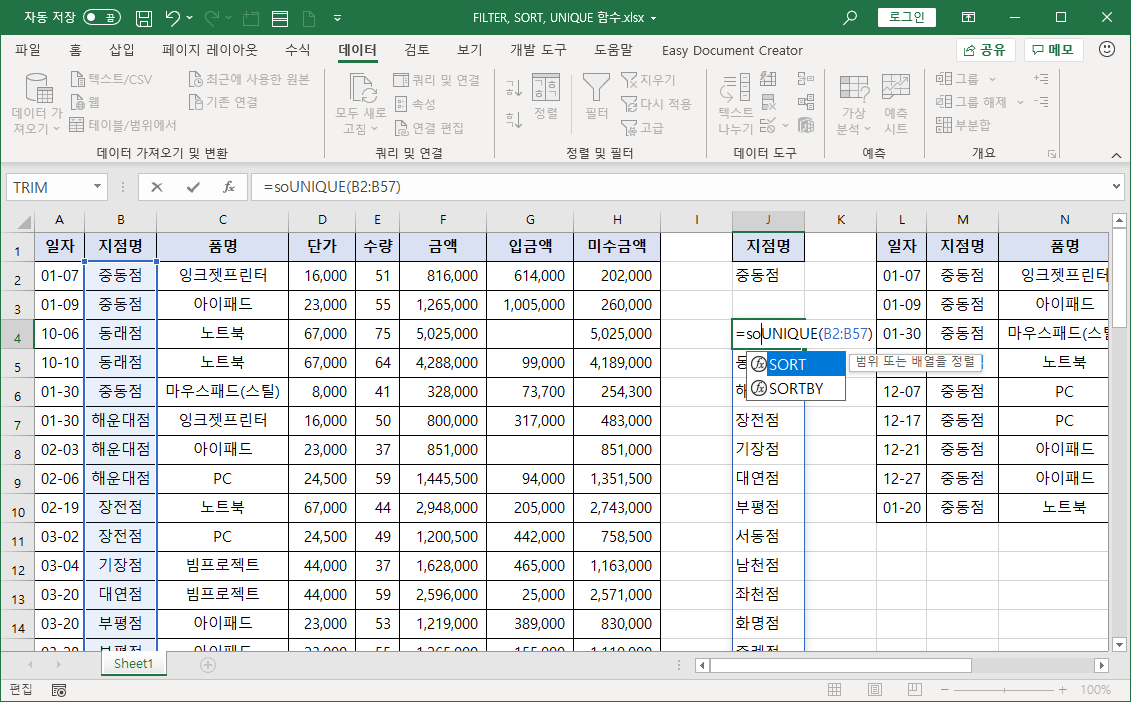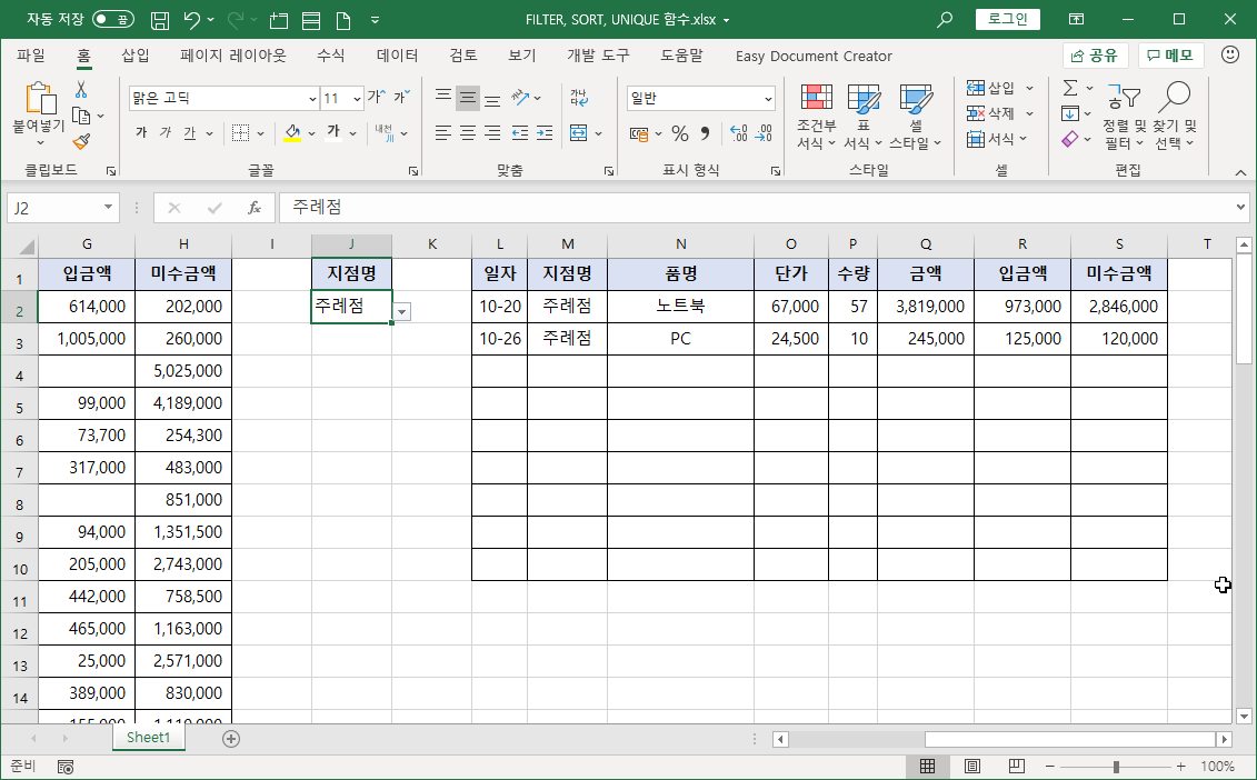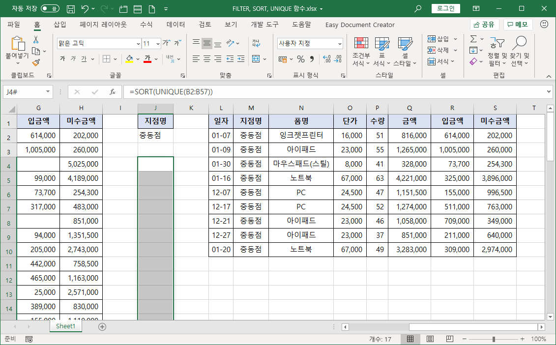 먼저 B열 지점명을 중복 제거해서 [J4] 셀 위치에 나타내겠습니다.