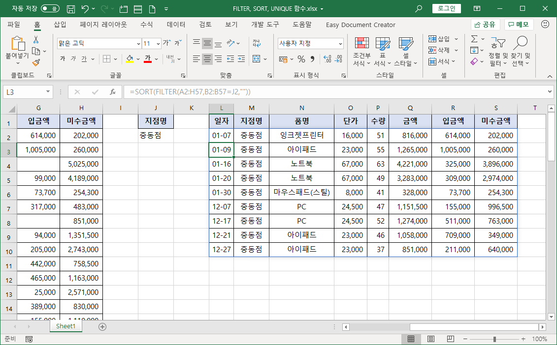 거래내역 중 지점명이 중동점인 항목만 뽑아 L열에 나타내려고 합니다.