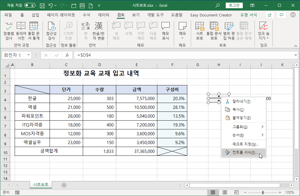 이제 사용자가 직접 [D4] 셀 값을 바꿀 수 없도록 [검토]-[보호]-[시트 보호]를 선택합니다.