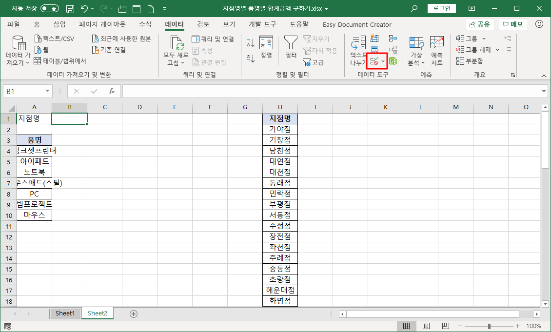새 시트를 하나 추가해 지점별 품명별 판매금액을 나타냅니다.