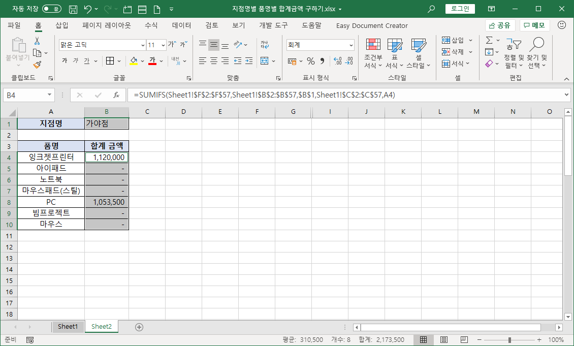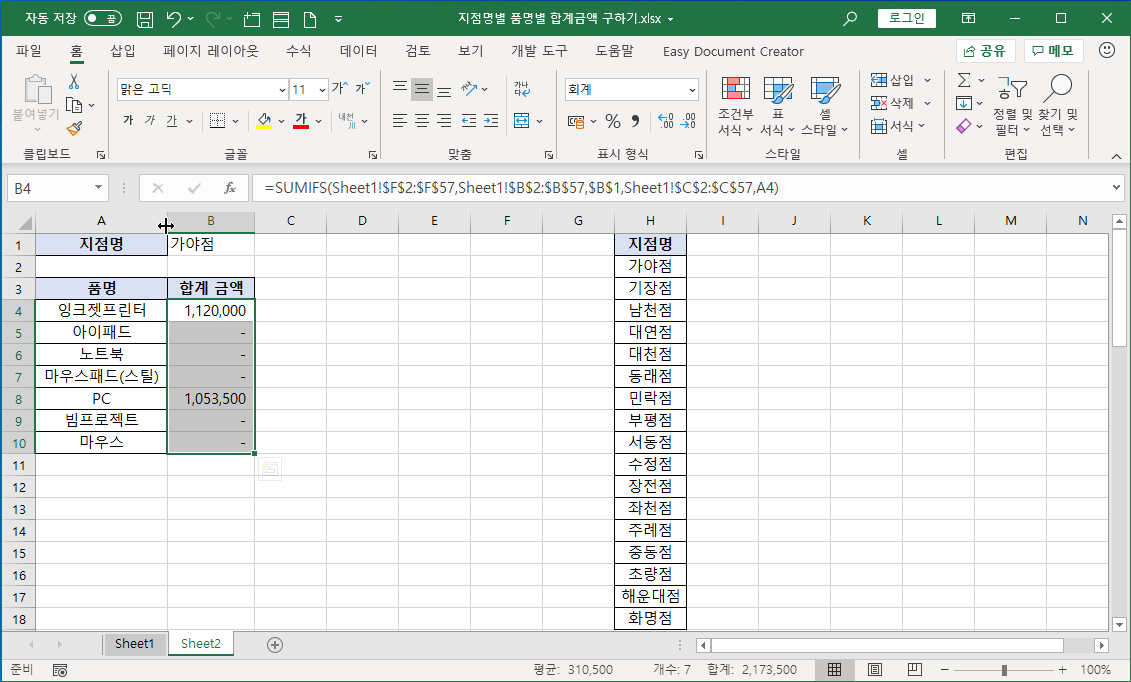 이번 강좌에서는 데이터 유효성 검사 기능으로 지점명 목록을 표시하고, 사용자가 지점명을 선택하면 품명별 판매금액 합계를 SUMIFS 함수로 수식을 작성해 나타내 보겠습니다.