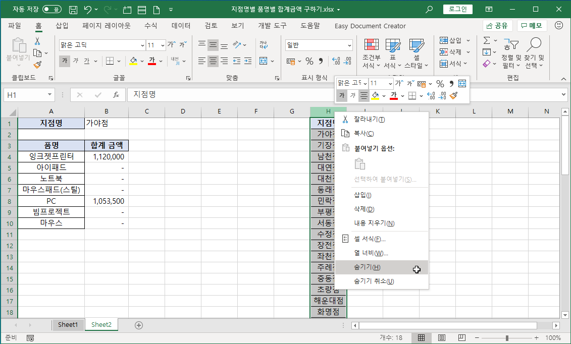 H열 머리글을 클릭한 뒤 마우스 오른쪽 단추를 눌러 메뉴를 표시하고 [숨기기]를 선택합니다.