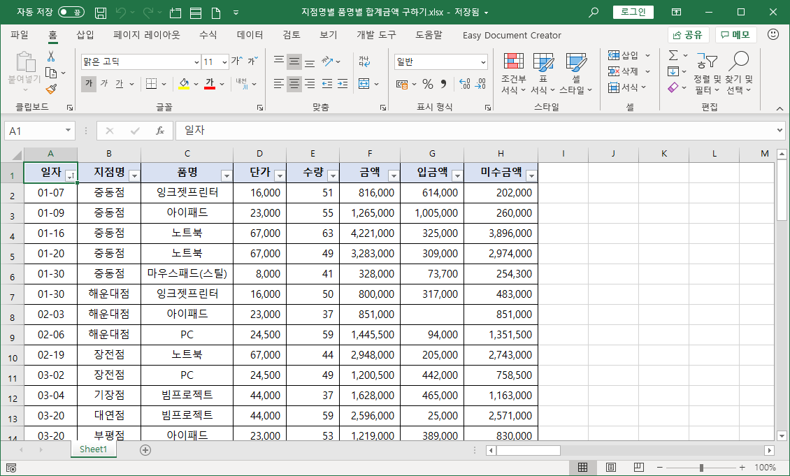 판매내역을 지점명과 품명을 기준으로 집계하여 보기 좋게 나타내는 방법을 소개하겠습니다.
