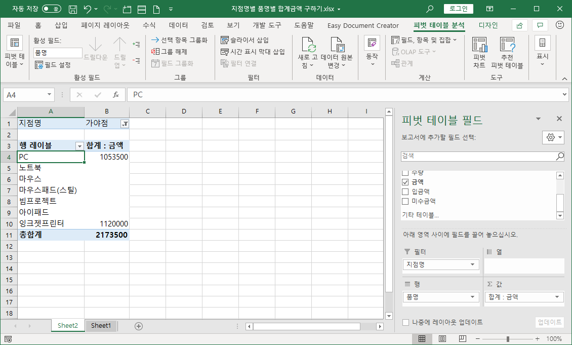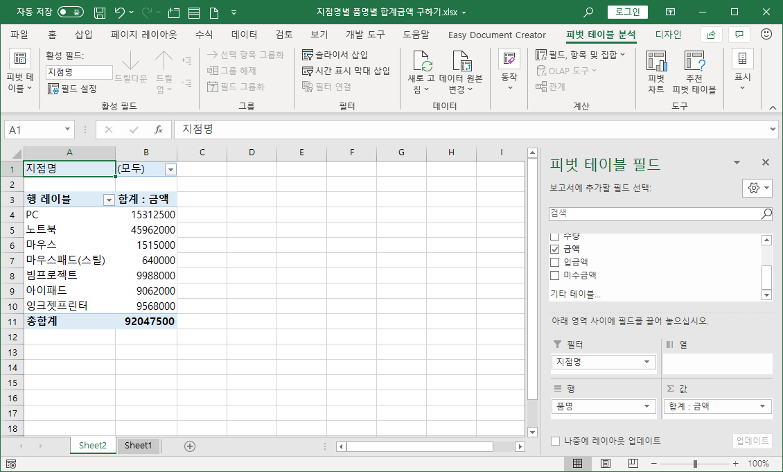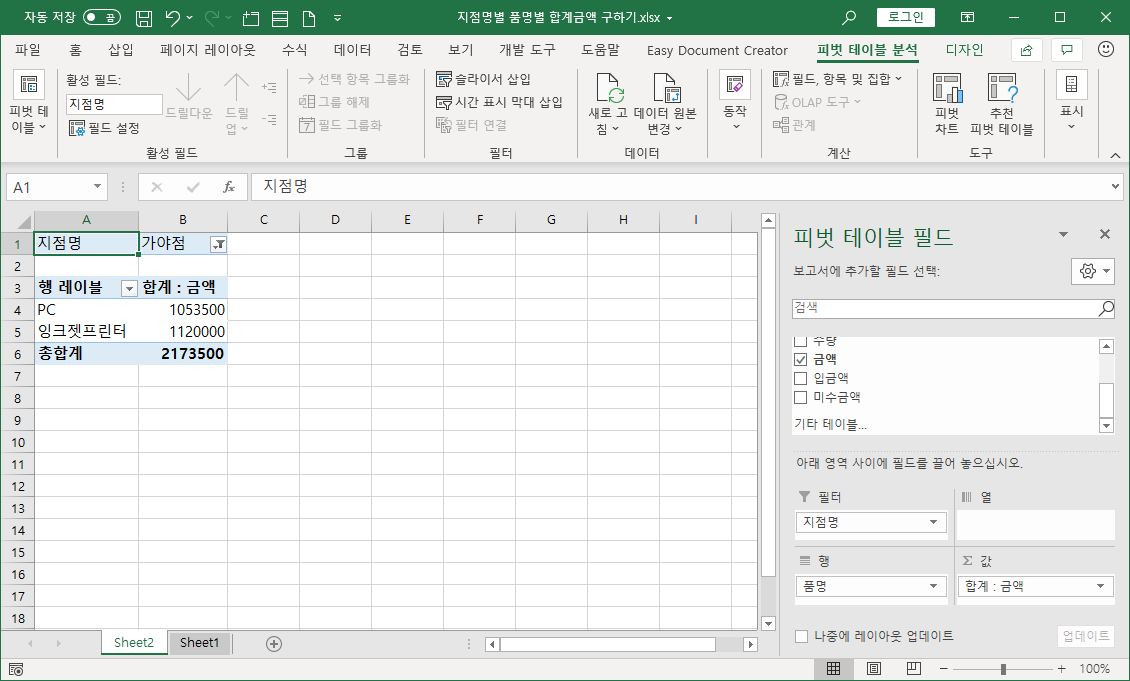 오른쪽 피벗 테이블 필드 창에서 지점명 필드를 끌어 [필터]에 놓고, 품명 필드를 끌어 [행], 금액 필드를 끌어 [값]에 놓습니다.