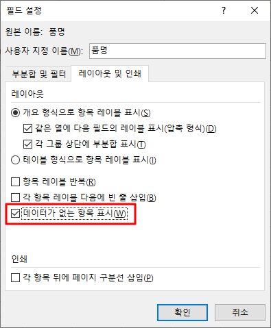 [필드 설정] 대화상자에서 [레이아웃 및 인쇄] 탭을 선택한 뒤 [데이터가 없는 항목 표시]를 체크하고 [확인]을 누릅니다.