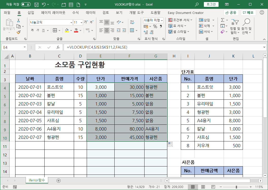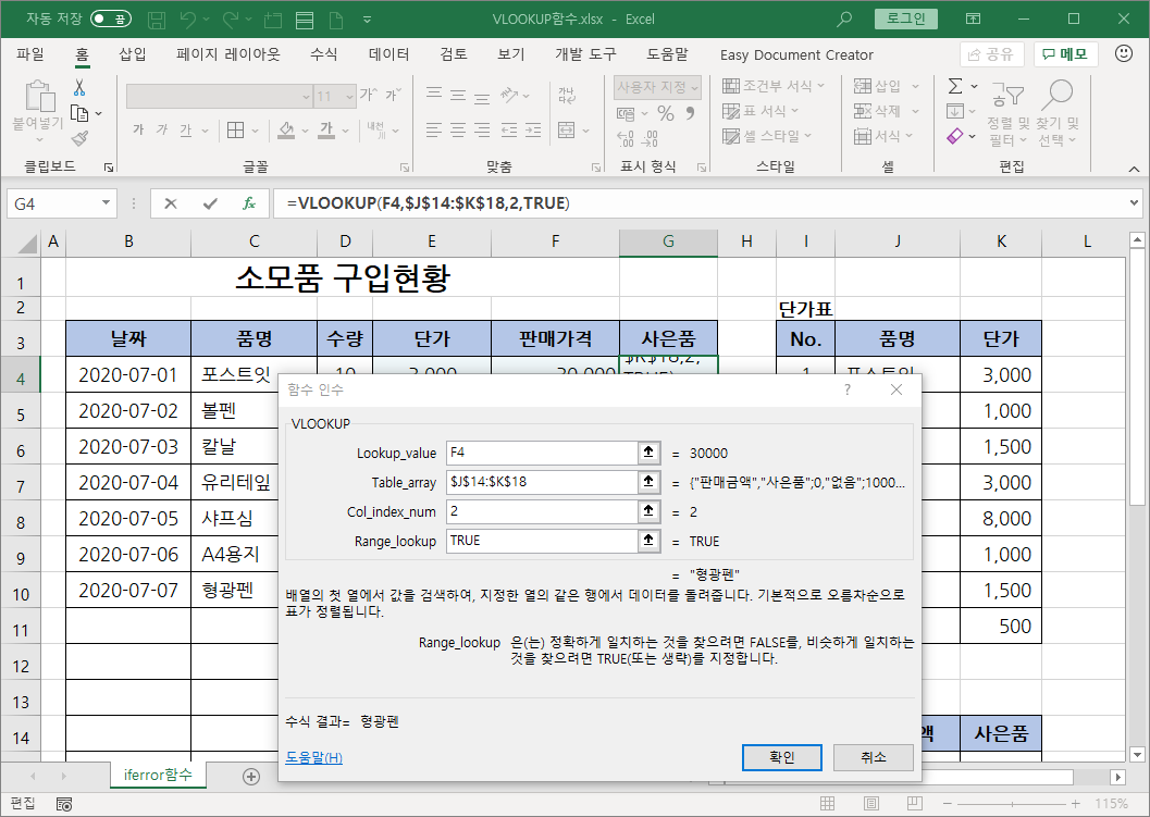 결론으로 VLOOKUP 함수 두번째 인수 Table_array에 필드명에 해당하는 '품명', '단가', '판매금액', '사은품'을 포함해 범위를 지정해도 함수가 실행되는 것에는 영향을 미치지 않습니다.