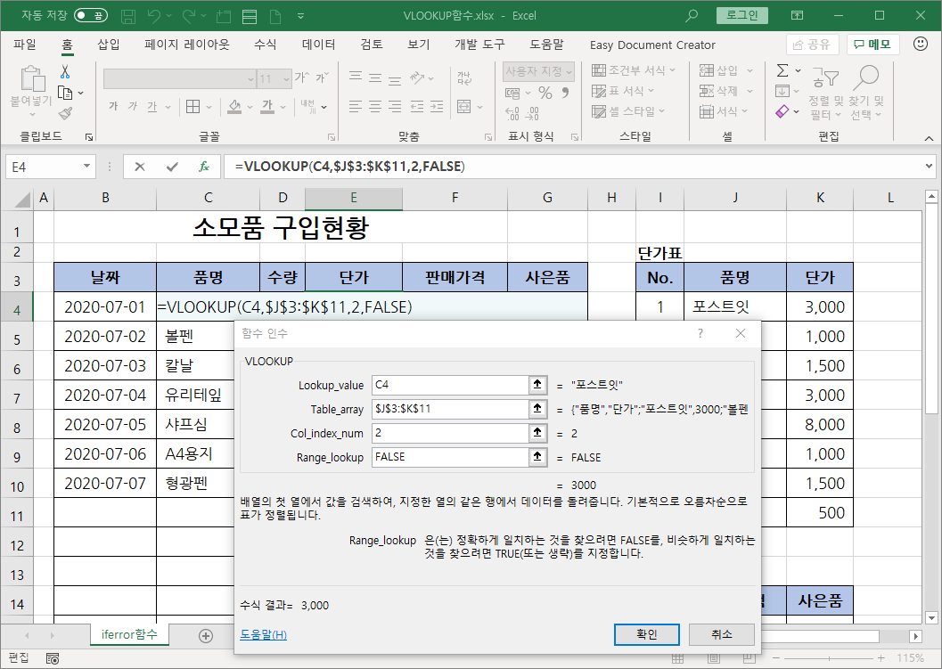 [J3] 셀 '품명'과 [K3] 셀 '단가'는 J열과 K열에 입력된 내용이 무엇인지 단가표를 보는 사람에게 알려주는 역할을 할뿐이고, VLOOKUP 함수에서는 의미없는 데이터입니다.