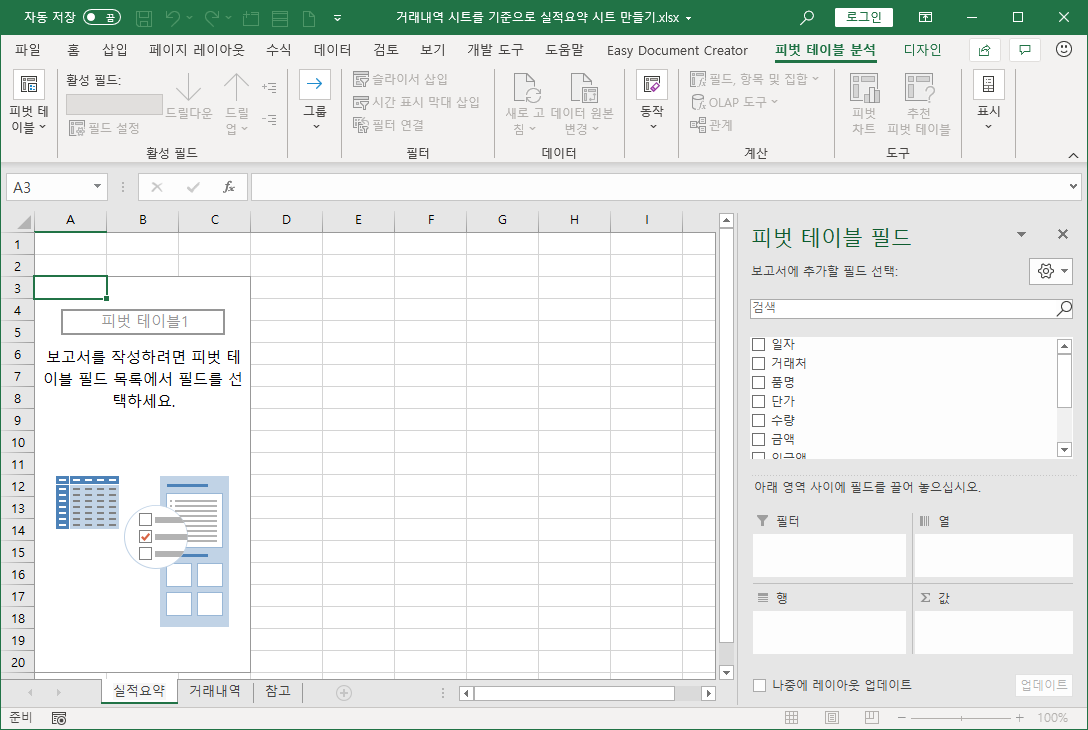 피벗 테이블 필드 목록에서 일자, 거래처, 품명을 순서대로 필드명 앞 사각형을 클릭해 체크 표시가 나타나도록 합니다.