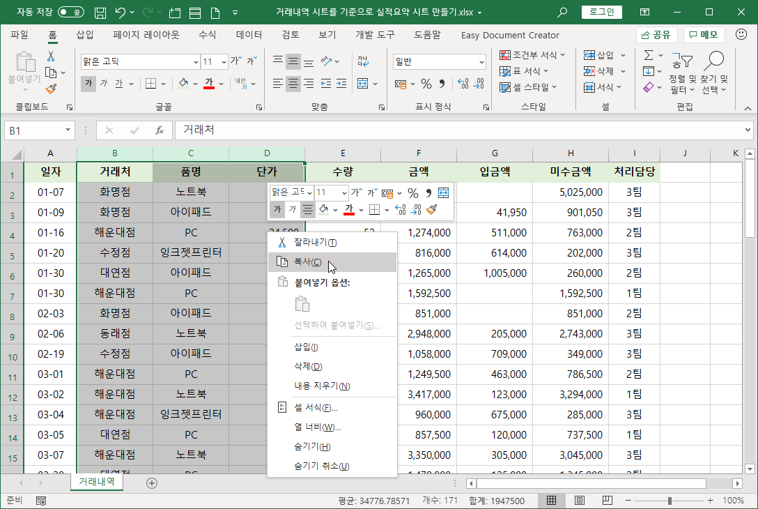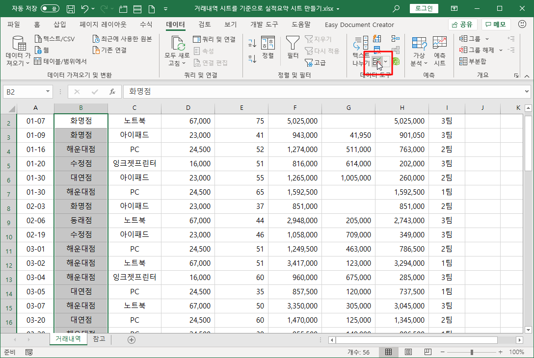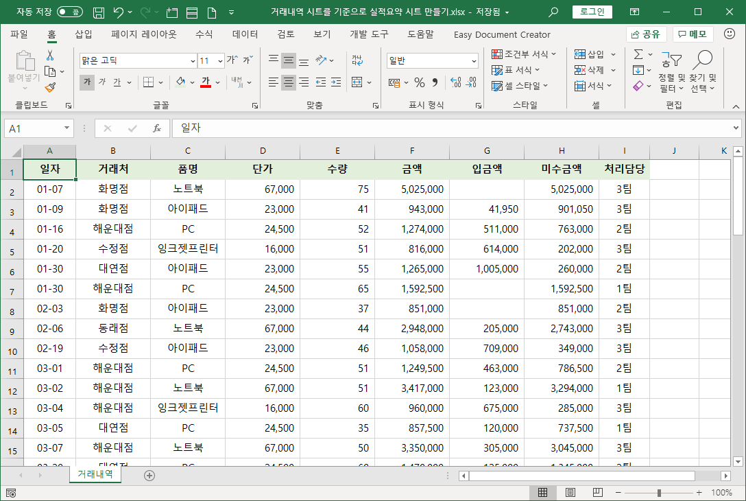 그래서 구분할 수 있는 최대한 필드를 나눠 거래내역 시트를 구성하는 것이 좋습니다.