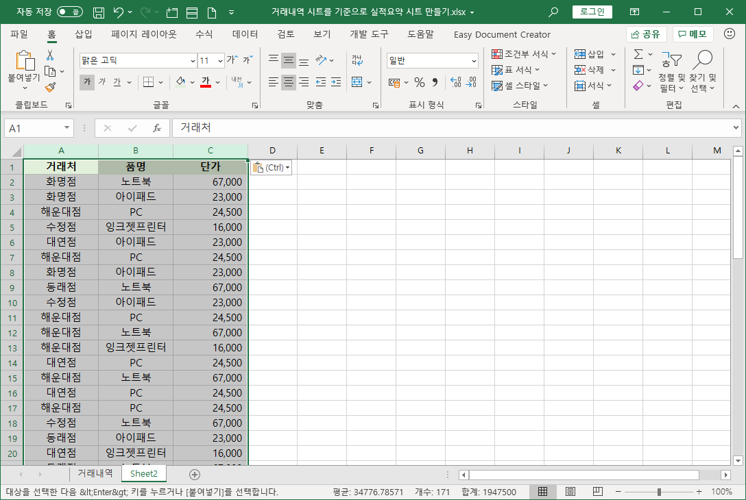 현재는 거래처 목록과 품명/단가 목록을 만들 것입니다.