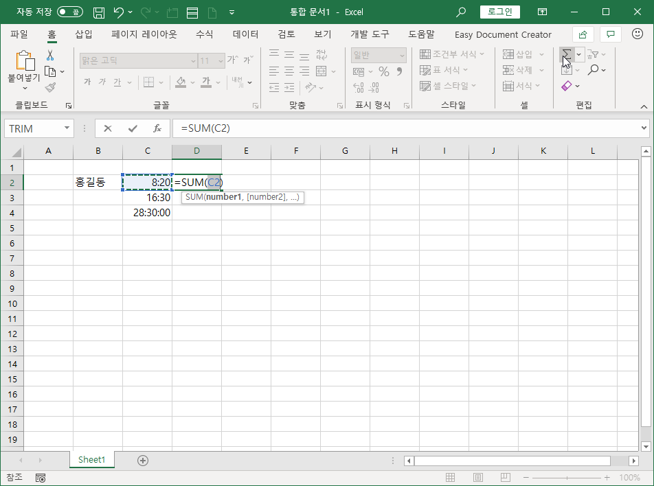 [D2] 셀을 선택한 뒤 [홈]-[자동 합계]를 누릅니다.