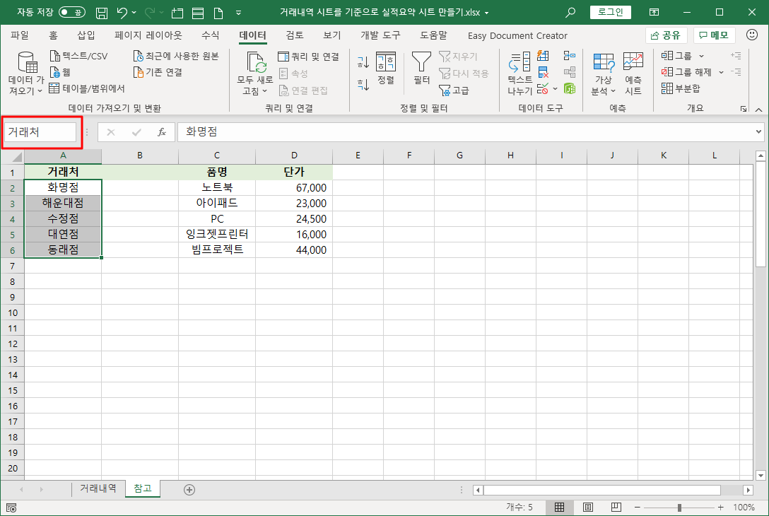 참고시트 [A2:A6] 셀 범위를 선택하고 수식 입력줄 이름상자에 커서를 두고 거래처라고 입력한 뒤 <Enter>를 누릅니다.