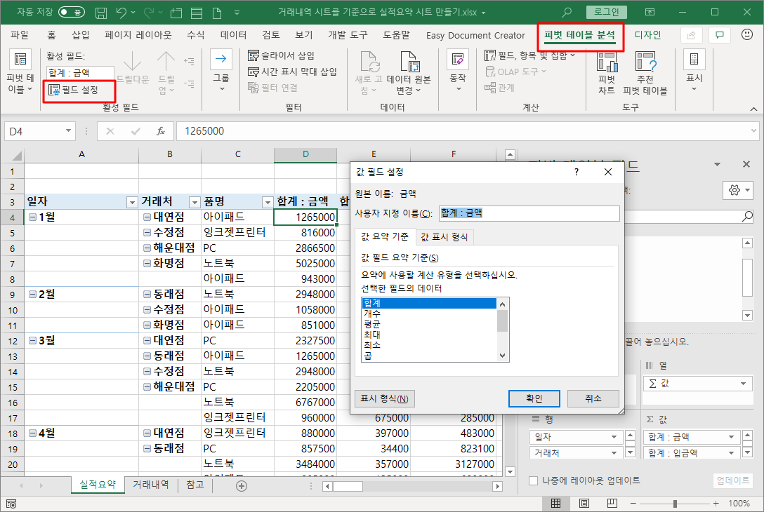 [D4] 셀에 커서를 두고 [피벗 테이블 분석]-[활성 필드]-[필드 설정]를 누릅니다.
