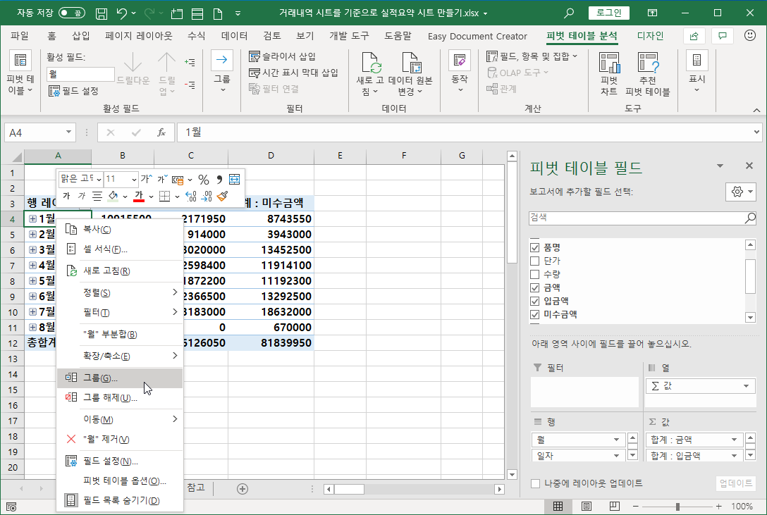 거래일자를 행 항목으로 넣게 되면 자동으로 그룹 설정이 되어 월, 일별로 그룹이 됩니다.