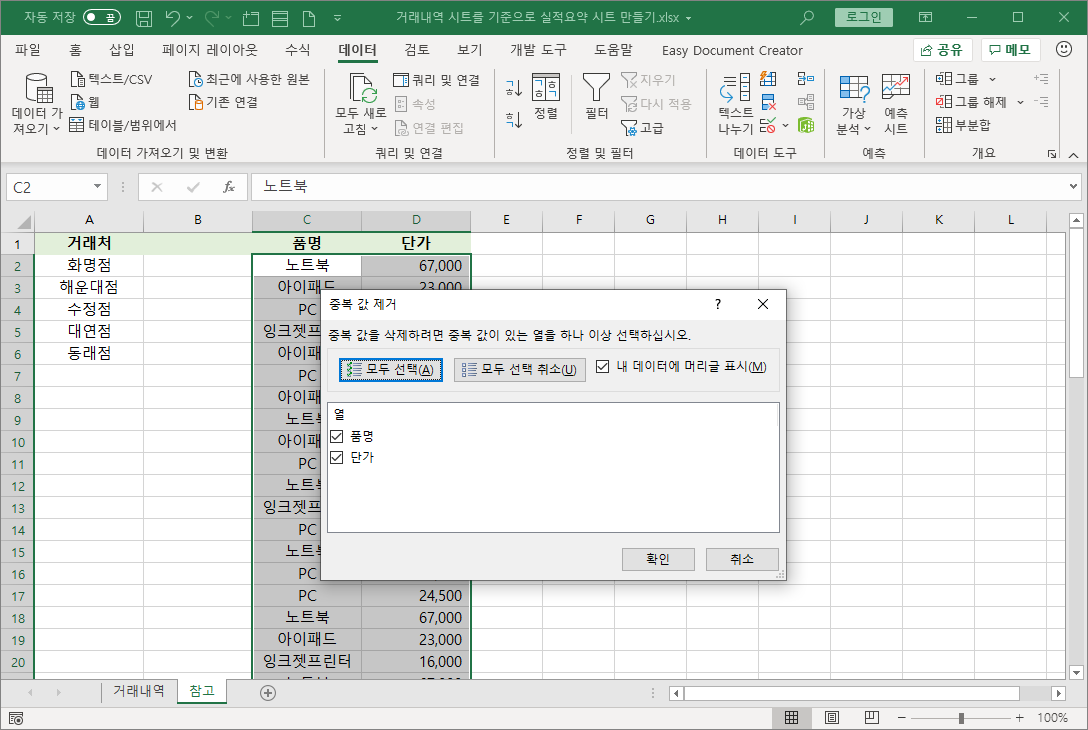 [중복 값 제거] 대화상자에서 [확인]을 눌러 중복 거래처를 제거합니다.
