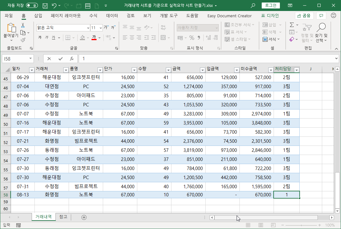 이상으로 거래내역을 입력해 실적요약을 만드는 방법을 알아봤습니다.