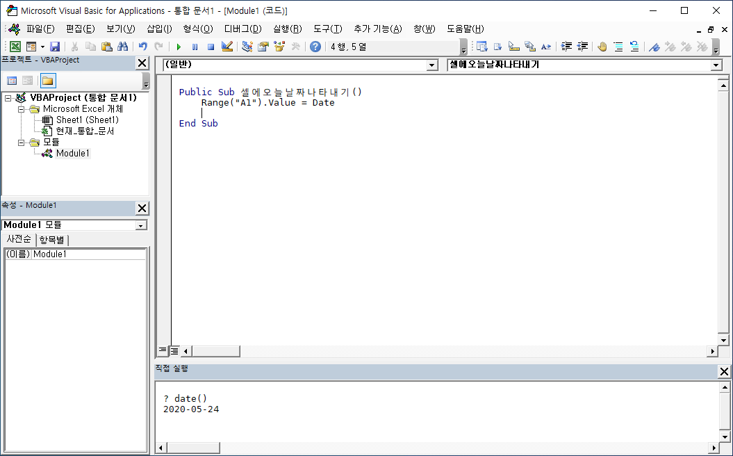 range("A1").value=date()라고 입력합니다.